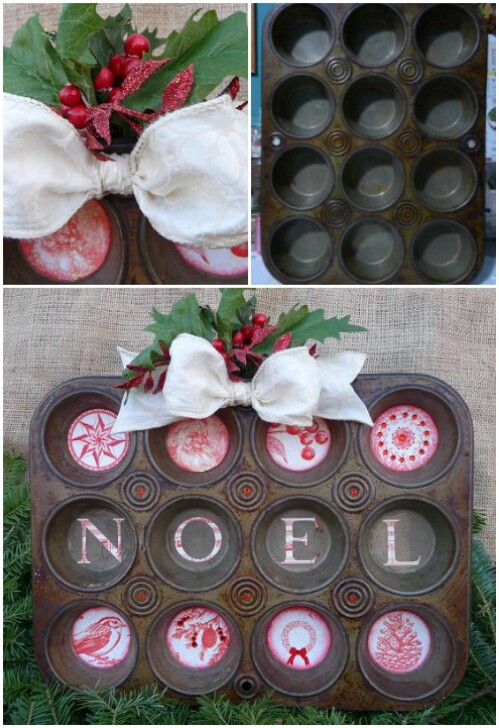 If you have an old muffin tin that you are thinking of tossing and replacing here is an idea for up-cycling it into a low from things you get at the dollar or craft store (to no-cost Christmas decoration depending on what you have on hand).